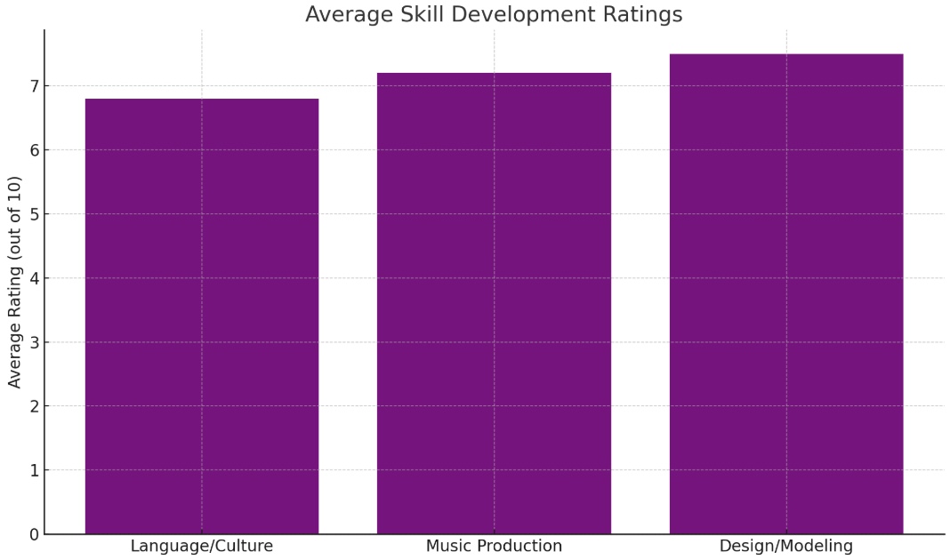 - Balanced skill development: Students reported relatively balanced improvement across language/culture, music production, and design/modeling, with design/modeling slightly higher.