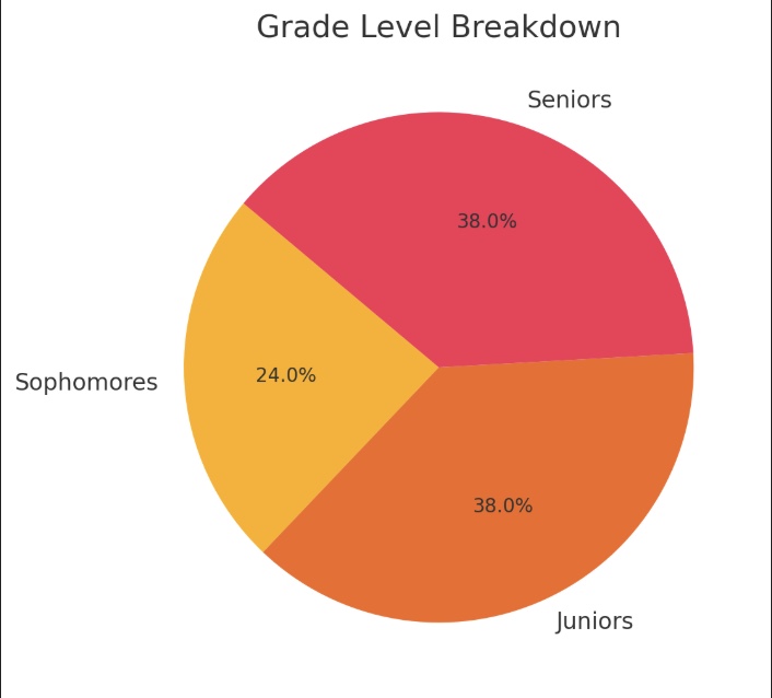 Pie chart showing Sophomores (24%), Juniors (38%), and Seniors (38%).