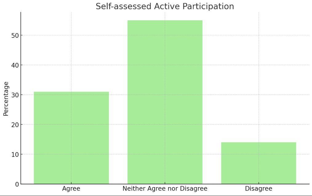 - Varied participation comfort: While engagement was high, there was a notable spread in students' self-assessment as active participants, suggesting room for encouraging more active involvement from some students.